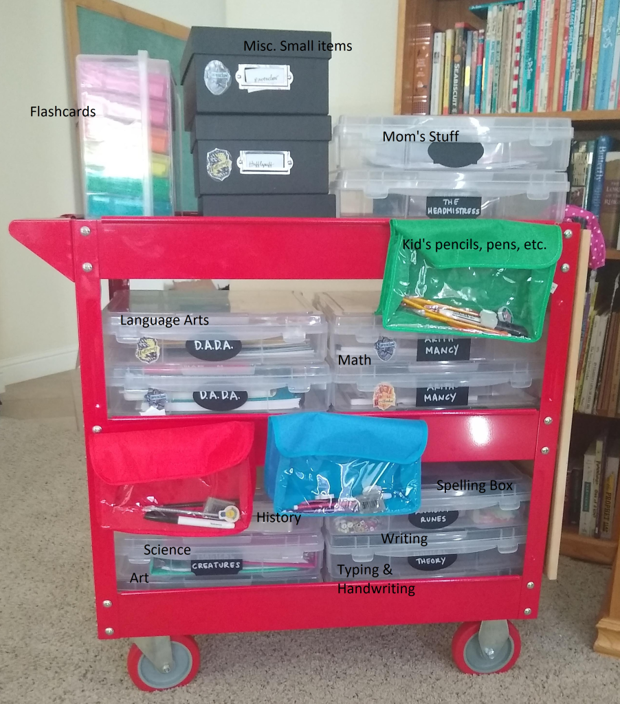 The cart is from Harbor Freight (with a hefty coupon, of course), and the clear boxes are 12×12 scrapbooking totes from Michaels, which I had the good fortune to find for 60% off this summer, along with the colored picture holder tote. Since we don’t have a 100% dedicated homeschool room, we can wheel our cart wherever we need it, or take individual subjects with us if we leave the house.